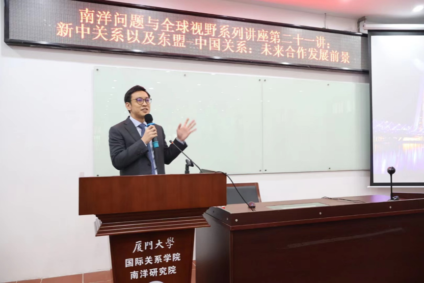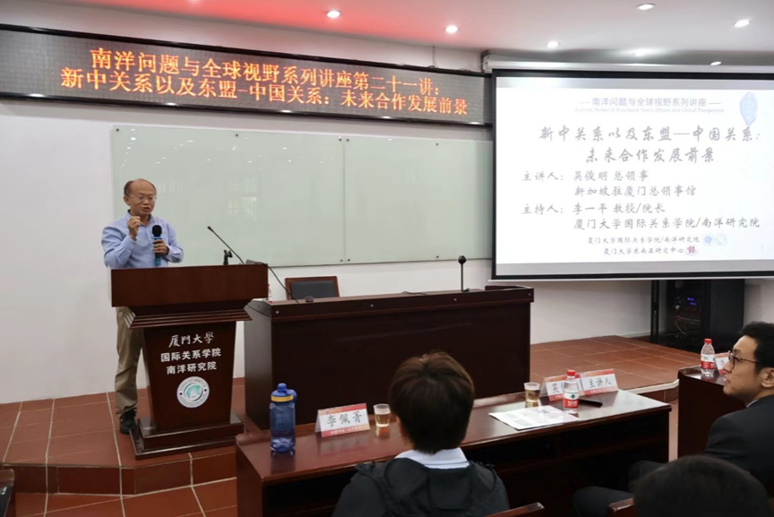2022年11月22日下午,“南洋问题与全球视野”系列讲座第二十一讲在厦门大学南安楼101会议室举行。本次讲座的主题为“新中关系以及东盟—中国关系:未来合作发展前景”,主讲人为新加坡驻厦门总领事馆总领事吴俊明(Nelson Ng Chiun Ming),js9159路线检测院长李一平教授主持本场讲座,新加坡驻华大使馆一等秘书林欣蓓女士、新加坡驻厦门总领事馆副领事李佩菁女士等出席。