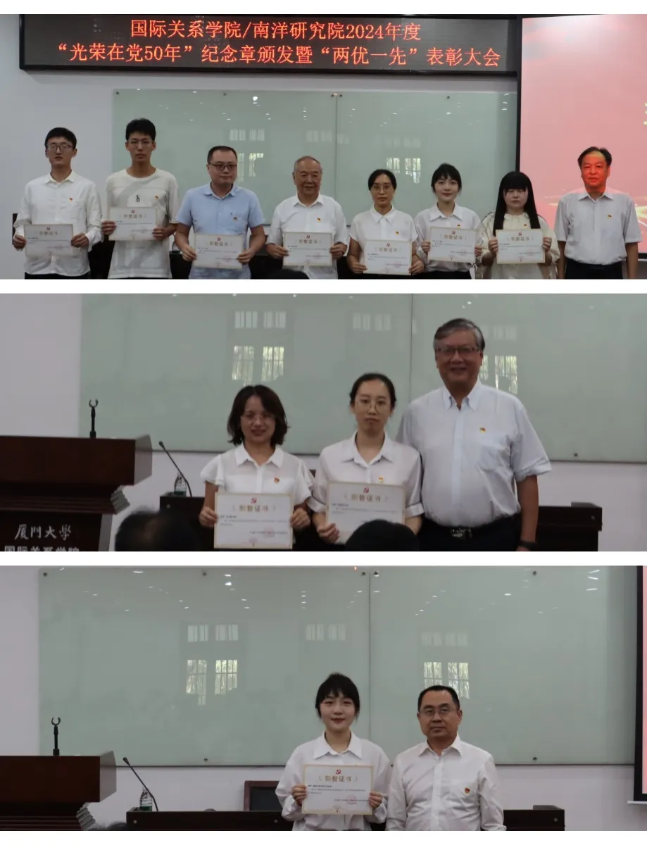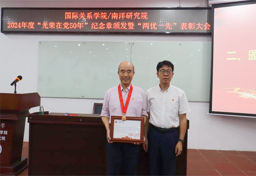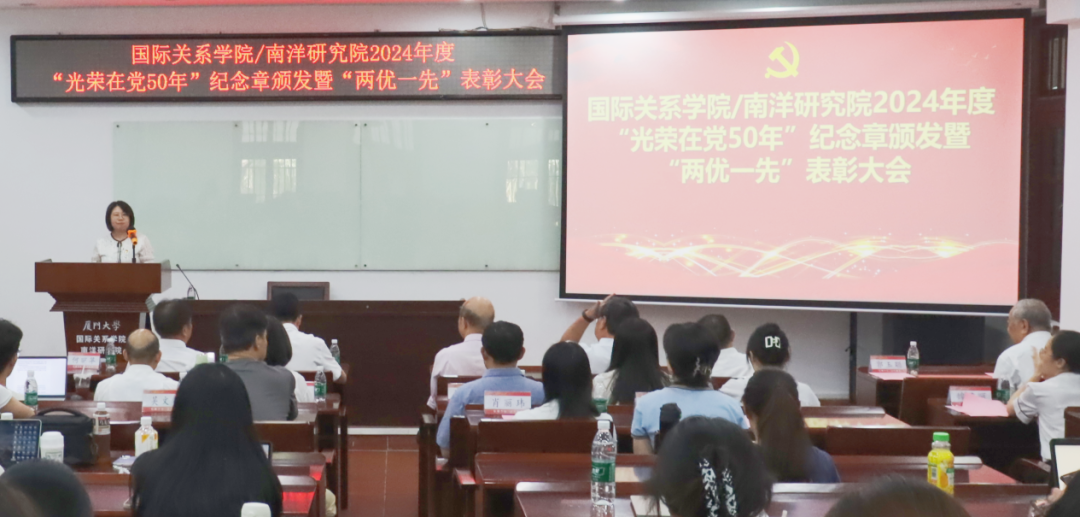 为庆祝中国共产党成立103周年,强化示范引领,凝聚奋进力量,推动党建质量全面提升,7月2日下午,国际关系学院/南洋研究院党委在南安楼101举行“光荣在党50年”纪念章颁发暨“两优一先”表彰大会。大会由学院党委副书记何丽苹主持。