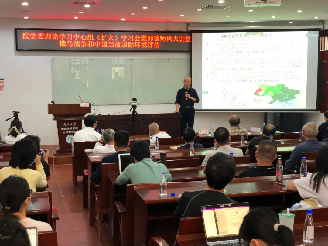 2022年4月15日下午,“俄乌战争和中国当前国际环境评估”讲座在厦门大学南安楼101、102与103室举行。主讲人为厦门大学特聘教授、国际关系学院/南洋研究院前院长、知名海外华人研究和东南亚研究专家庄国土教授。学院党委书记毛通文主持讲座,院党建联络员潘宝柱老师莅临指导,全体教师和党员学生参加讲座,来自华东师范大学、南京大学、南开大学、深圳市外办等海内外院校和单位的200余名师生线上参与了本次讲座。