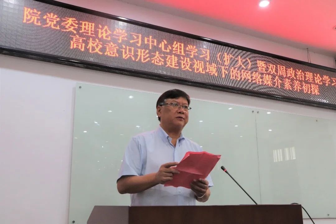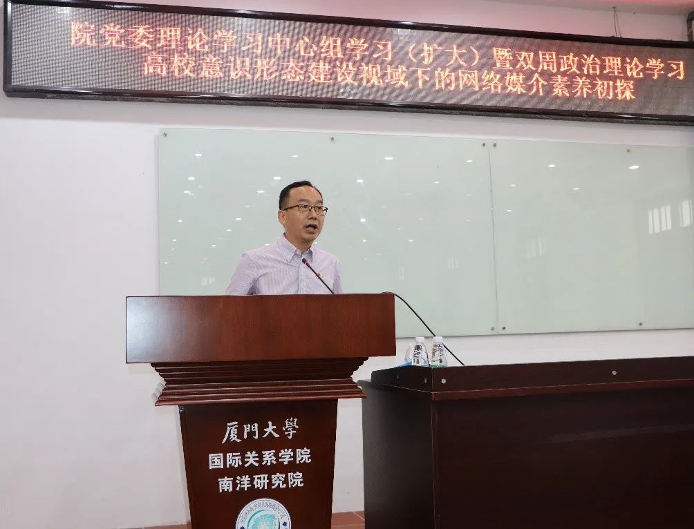 6月22日下午,院党委在南安楼101举行理论中心组学习会(扩大)暨双周政治理论学习。厦门大学新闻传播学院副院长苏俊斌应邀做《高校意识形态建设视域下的网络媒介素养初探》辅导报告。学院党委书记毛通文主持会议。学院全体教师和学生党员参加会议。