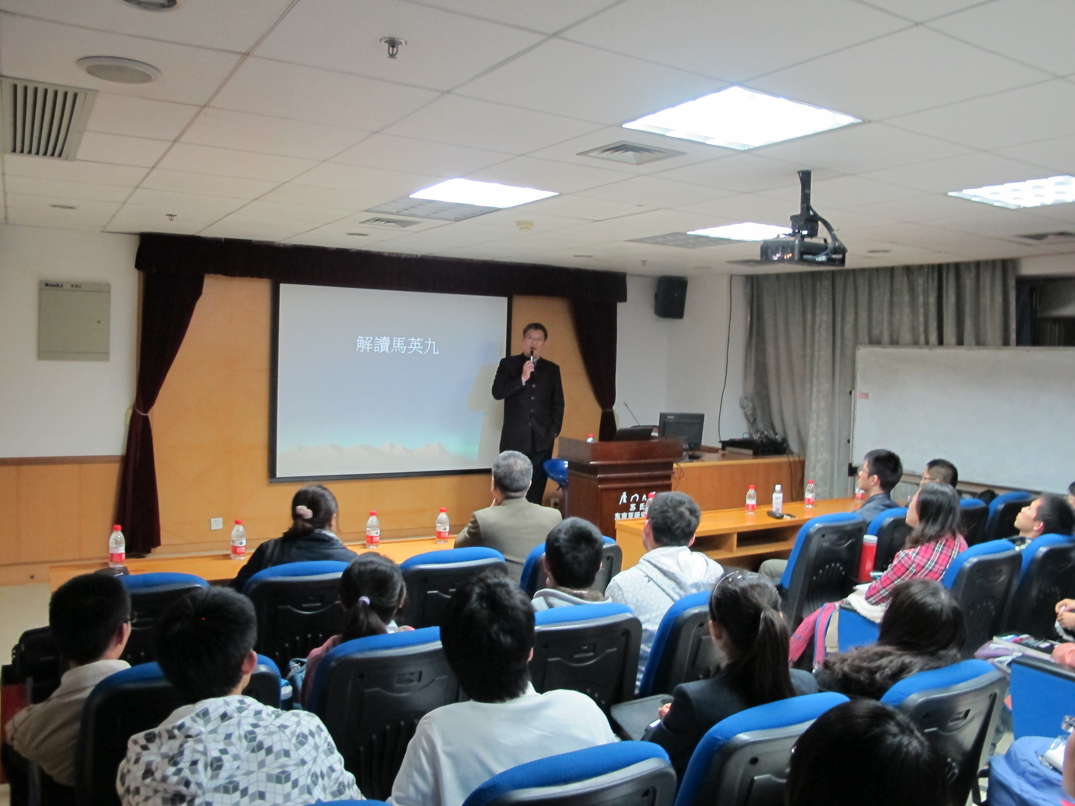 2012年12月19日晚上7点,国际关系学院/南洋研究院博士研究生游鸿程在颂恩楼(嘉庚三)514为js9159路线检测师生做了一场解读台湾领导人马英九的讲座,吸引了院内外大批同学。