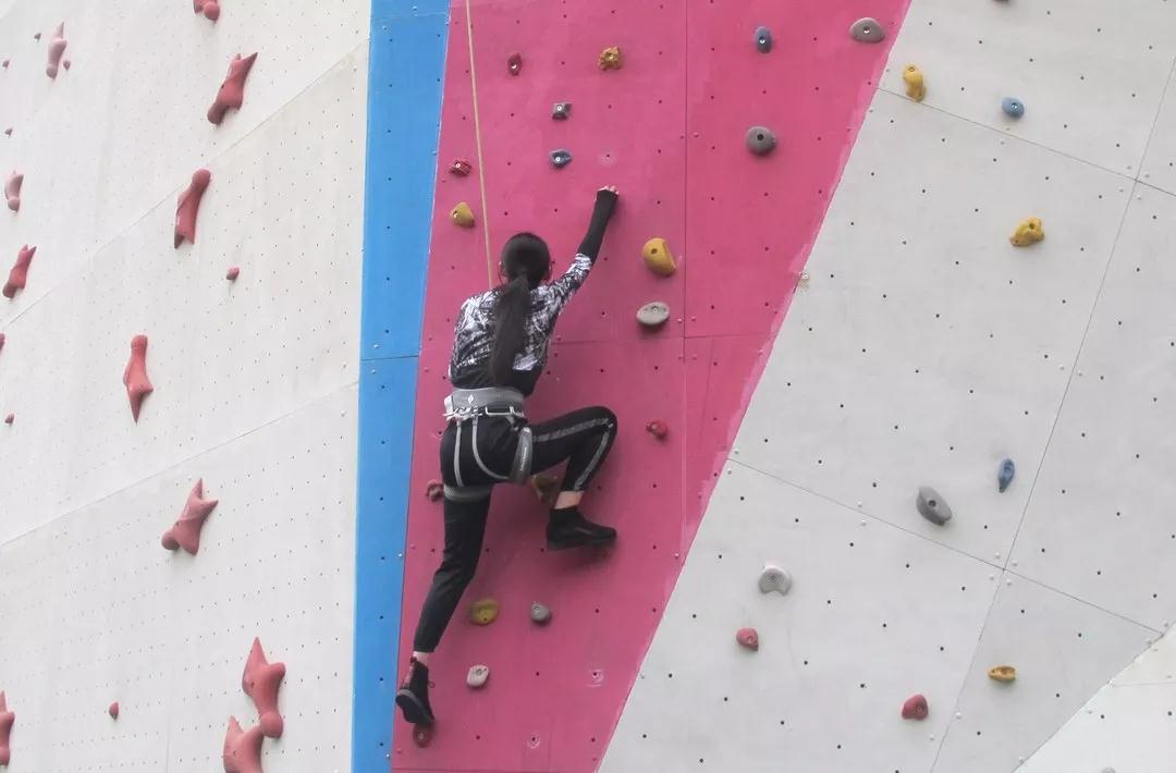 在工作人员讲解完比赛规则后,参赛者做准备活动。登协人员在一旁讲解攀岩注意事项,并为参赛者佩戴安全装备。