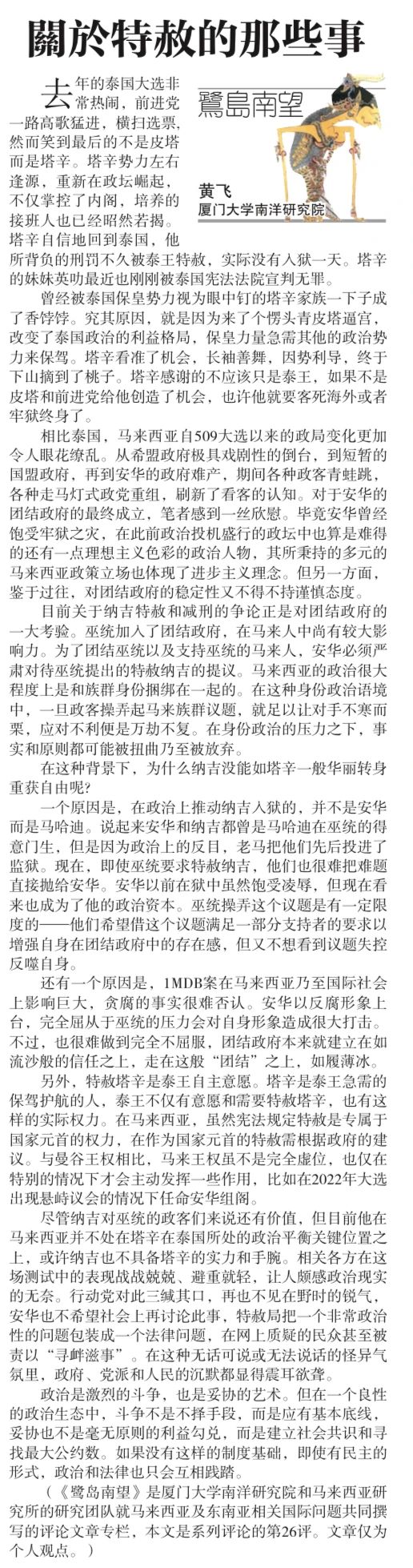另外,特赦塔辛是泰王自主意愿。塔辛是泰王急需的保驾护航的人,泰王不仅有意愿和需要特赦塔辛,也有这样的实际权力。在马来西亚,虽然宪法规定特赦是专属于国家元首的权力,在作为国家元首的特赦需根据政府的建议。与曼谷王权相比,马来王权虽不是完全虚位,也仅在特别的情况下才会主动发挥一些作用,比如在2022年大选出现悬峙议会的情况下任命安华组阁。