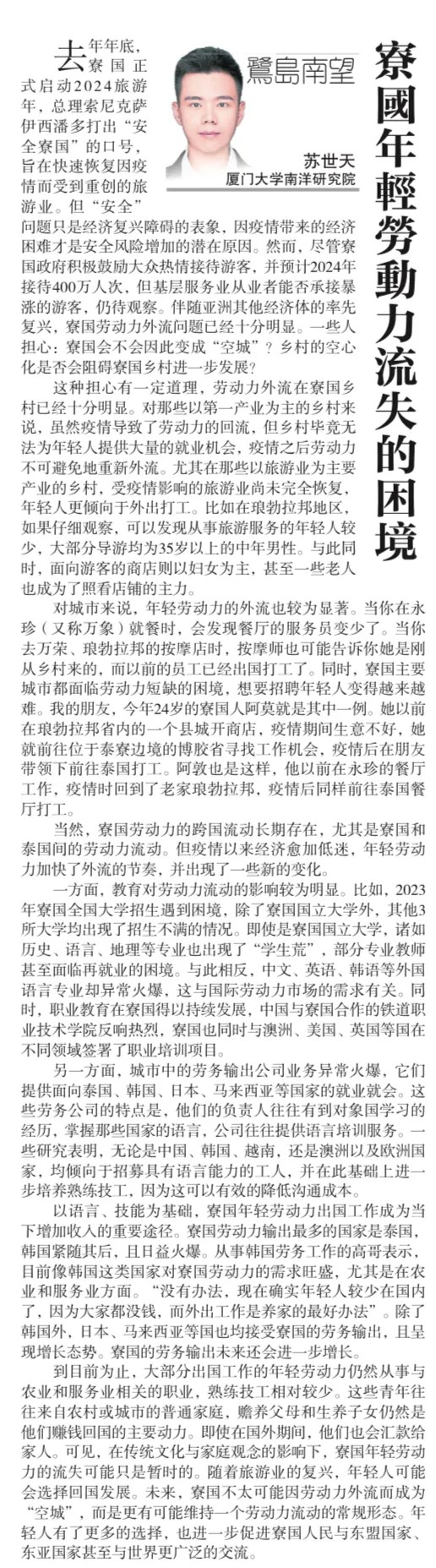 去年年底,寮国正式启动2024旅游年,总理索尼克萨伊西潘多打出“安全寮国”的口号,旨在快速恢复因疫情而受到重创的旅游业。但“安全”问题只是经济复兴障碍的表象,因疫情带来的经济困难才是安全风险增加的潜在原因。然而,尽管寮国政府积极鼓励大众热情接待游客,并预计2024年接待400万人次,但基层服务业从业者能否承接暴涨的游客,仍待观察。伴随亚洲其他经济体的率先复兴,寮国劳动力外流问题已经十分明显。一些人担心:寮国会不会因此变成“空城”?乡村的空心化是否会阻碍寮国乡村进一步发展?