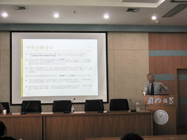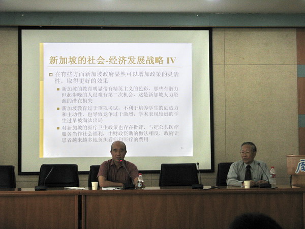 讲座中,黄朝翰从新加坡的经济发展、社会发展、经济——社会发展战略和新加坡面临的挑战四个方面具体介绍了新加坡的发展状况与成就。他指出,新加坡通过推行务实的社会政策、不拘束于社会形态的限制,不断推动工业化进程,从劳动力密集型产业升级为资本和技术密集型产业,同时也提高了产品附加值和劳动生产率。随后,他从教育、医疗、公共住房、社会福利和中央公积金等方面介绍了新加坡的社会发展状况,说明了新加坡对亚洲价值观认同以及个人社会责任感的重视,展示了新加坡政府在这些方面做出的卓有成效的贡献。黄朝翰还为大家介绍了新加坡的经济——社会发展战略。他指出了新加坡在经济增长的过程中对所产生的社会问题的认知与解决过程,他表示,新加坡“先发展、再分配”的社会经济发展战略是成功的,它促进了前所未有的物质繁荣以及对经济增长成果的广泛分享。黄朝翰最后对新加坡发展模式的前景进行了展望,并详细介绍了新加坡所面临的挑战同时提出了他所认为合理的解决方案。