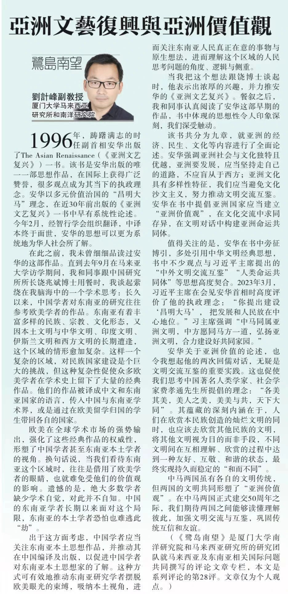 当我把这个想法跟饶博士谈起时,他表示出浓厚的兴趣,并力推安华的《亚洲文艺复兴》。餐叙之后,我和同事认真阅读了安华这部早期的作品,书中体现的思想性令人印象深刻,我们深受触动。