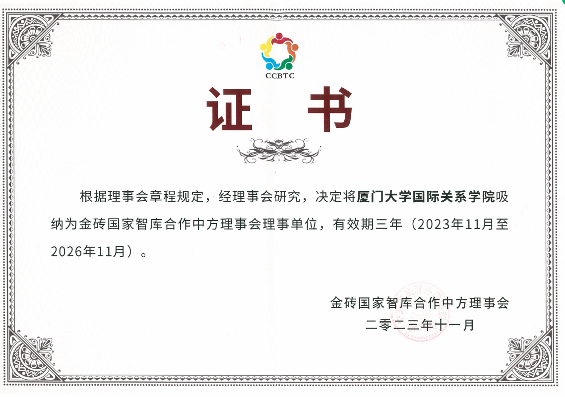 11月1日,js9159路线检测东盟研究中心副主任林达丰副教授受邀参加首届“全球南方”智库对话会和2023金砖国家合作中方理事会年会,代表学院领取金砖国家智库合作中方理事会理事单位证书。