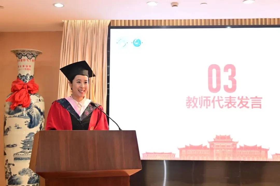 接着,教师代表张淼副教授发言。她表示,十分期待毕业生们在更大的舞台上大施拳脚,面临即将到来的离别,她内心有着极大的不舍。她向毕业生们分享了以下三句话:一是保持困惑、保持思考;二是保持真诚、保持热爱;三是谢谢你,再见。最后她希望所有的毕业生能够养成终身学习的习惯、拥有感知幸福的能力,带着国关南洋老师们的感恩与祝福,稳稳地走向自己想要的生活、理想的人生。