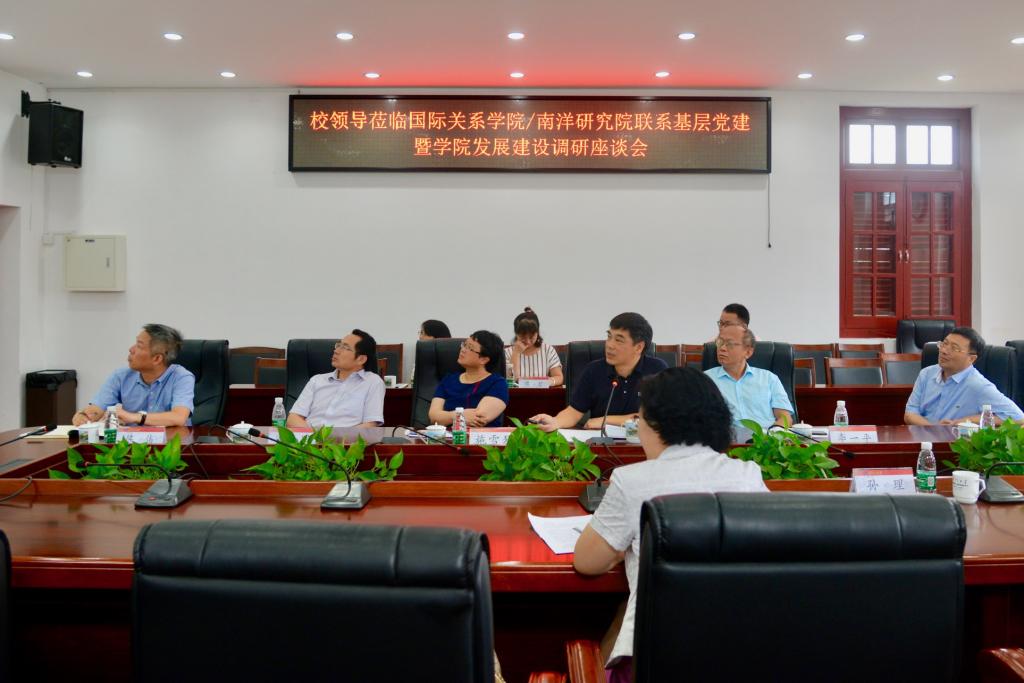 2019年7月4日上午,在南安楼301(3)会议室,召开了校领导莅临国际关系学院/南洋研究院联系基层党建及学院发展建设调研座谈会。邓朝晖副校长出席了本次会议,会议由国际关系学院/南洋研究院张必华书记主持,国际关系学院/南洋研究院参会人员包括院党政领导班子成员、系所领导、科级干部、辅导员等。