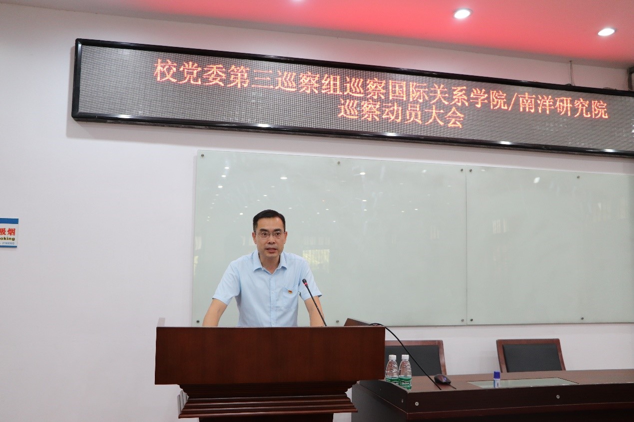 学院党委书记张必华代表学院党委作表态发言。他表示,国际关系学院/南洋研究院全院教职员工要充分认识本次政治巡察工作的重大意义,切实增强接受监督的意识,把配合巡察工作作为一项重要的政治任务,认真履行配合、支持的义务,全力配合巡察工作,协助巡察组顺利开展并完成对学院的巡察。