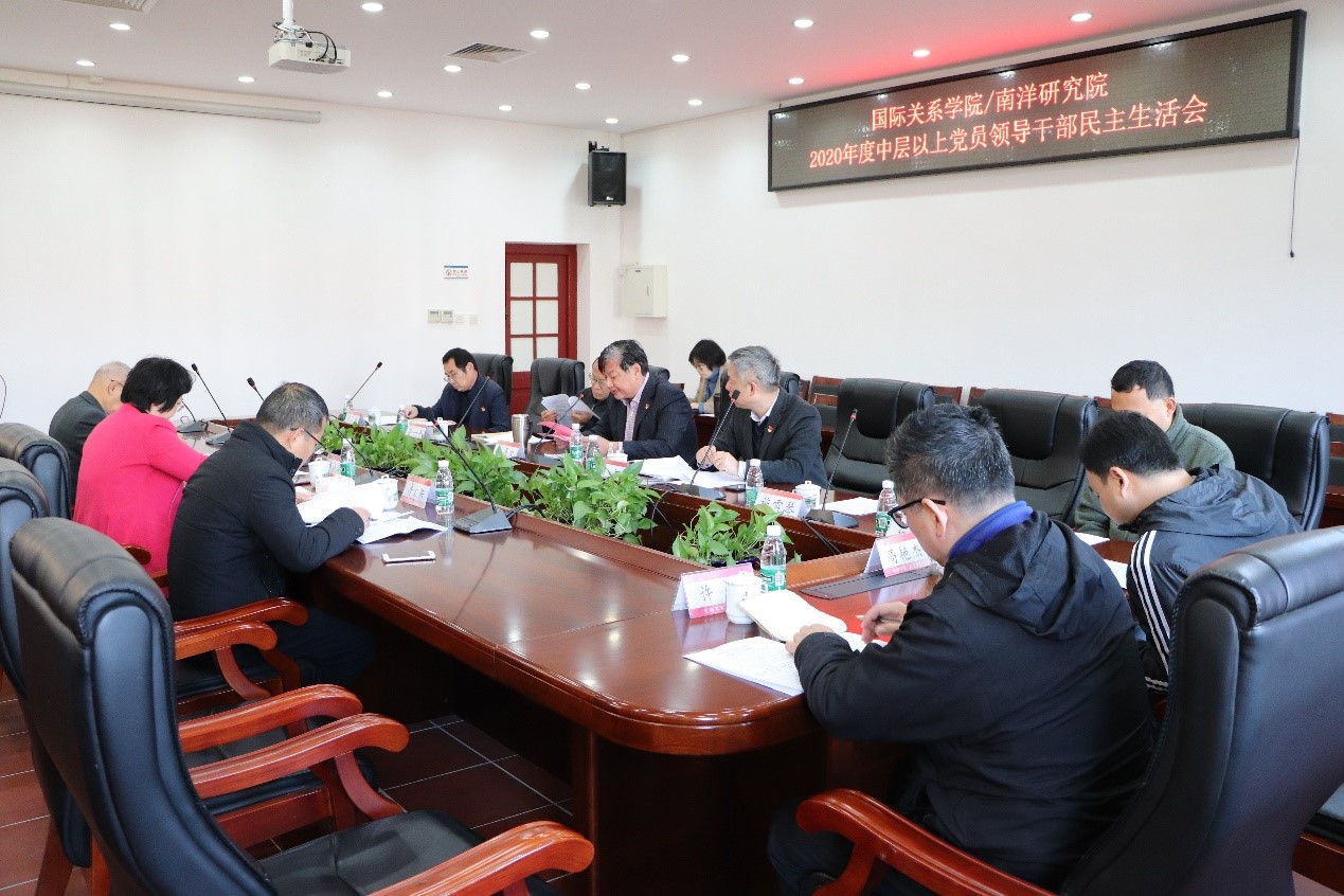 最后,毛通文书记在表态发言中指出,2020年是全面建成小康社会目标实现之年,是全面打赢脱贫攻坚战收官之年。2021年将迎来中国共产党成立100周年和厦门大学建校100周年,也是“十四五”规划的开局之年。学院以此次民主生活会为契机,进一步加强领导班子自身建设,坚决扛起全面从严治党责任,顺利完成学院党委换届、百年党庆和百年校庆的相关活动组织,针对会上开展批评和自我批评情况,学院领导班子将进一步研究讨论,明确整改方向,把此次民主生活会上提出的问题整改,与今年上半年校党委对学院的巡察、与“不忘初心、牢记使命”主题教育专题民主生活会等问题整改贯通起来,补齐短板弱项,进一步凝心聚力团结带领广大党员干部和师生员工加快推进学院的“双一流”建设,坚持以一流党建引领学院一流建设,为实现国际关系学院/南洋研究院在学校“新百年”征程的新发展而共同奋斗。
