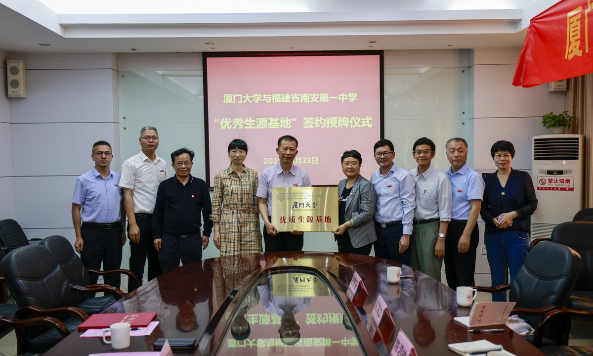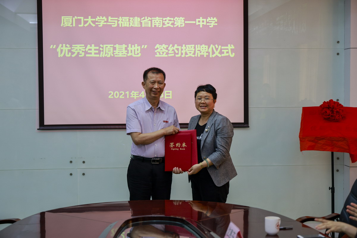 为积极应对新高考更聚焦学科专业的新形势和新挑战,加强考生咨询服务工作,更好地展现学院学科专业和本科人才培养优势特色 ,为加强厦门大学与重点生源中学的交流联系,做好优秀学生的衔接培养,建立合作共赢的长效机制,4月23日,厦门大学学生工作部(处)副处长、厦门大学泉州招生宣传组组长陈泗林,国际关系学院施雪琴副院长,国际关系学院系主任赵海立副教授,国际关系学院聂德宁教授、沈惠芬副教授等一行赴南安一中参加“厦门大学优质生源基地”授牌仪式。南安一中校长陈国璋,书记陈兴利等校领导以及300余名学生代表出席了活动。