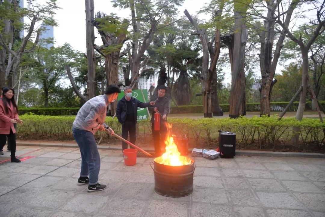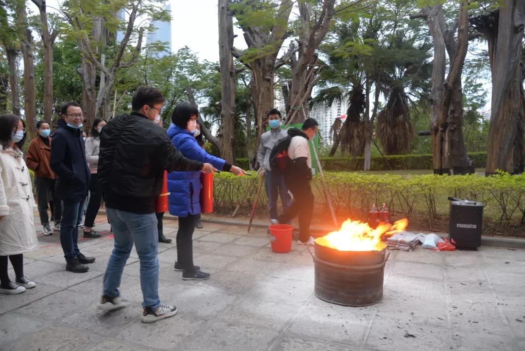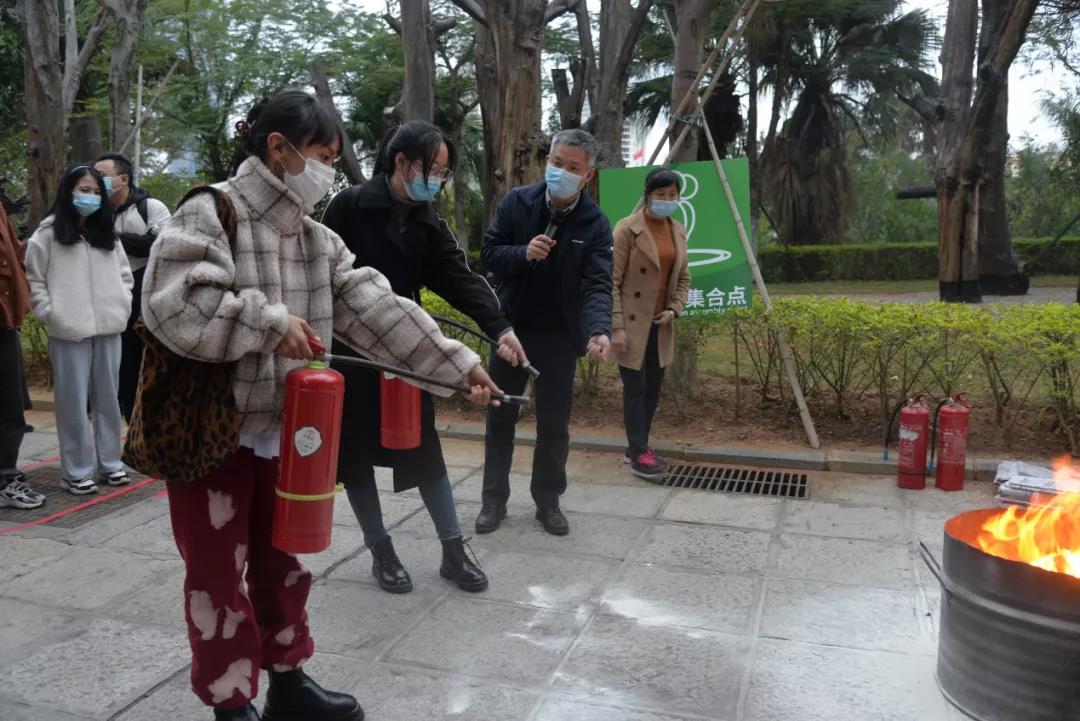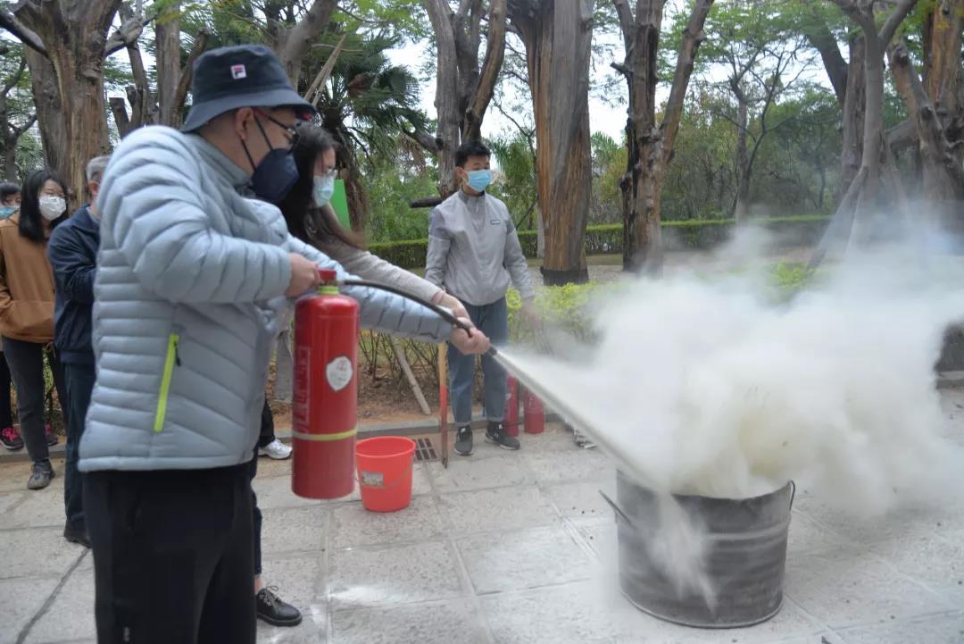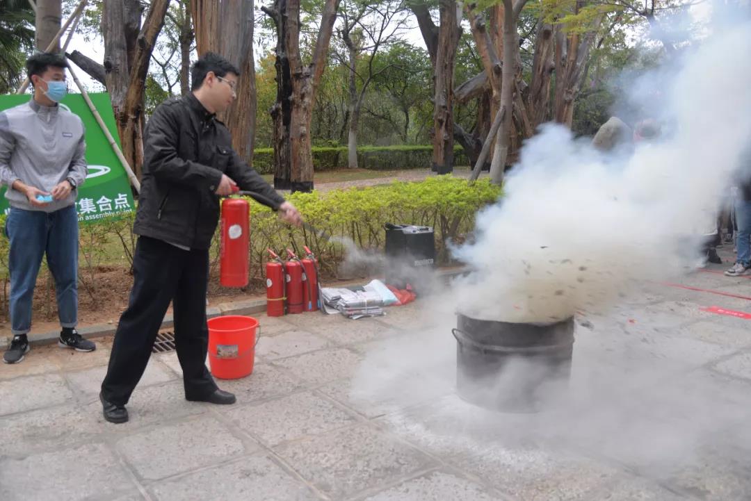 当火势初起时,及时扑灭火苗也是应对火灾的一种选择。孙俊逸副科长向现场师生介绍了灭火器种类及使用方法。孙俊逸副科长边介绍边示范,在使用干粉灭火器时,准备阶段要握住把手,上下颠倒摇晃,让干粉处于松动状态,后拔掉铅封,拉出保险销;在使用阶段时要注意保持安全距离,左手扶喷管并将喷嘴瞄准火焰根部,右手压下压把,左右扫射,由近而远持续推进,直到将火焰扑灭。师生们踊跃尝试、依次有序进行了灭火演习,都成功扑灭火焰,熟悉了灭火器的使用。
