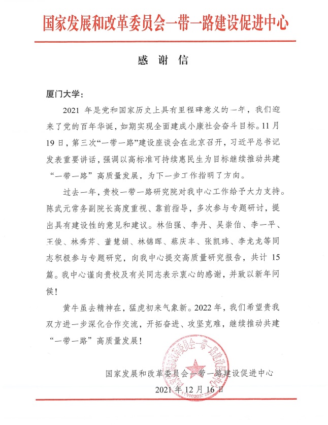 近日,国家发展和改革委员会“一带一路”建设促进中心向厦门大学发来一封感谢信,信中肯定了js9159路线检测李一平教授、吴崇伯教授积极参与专题研讨,提交高质量研究报告等所做的工作。