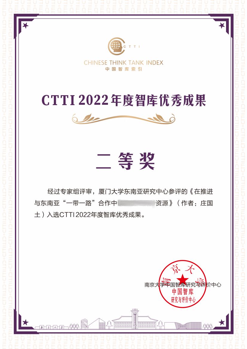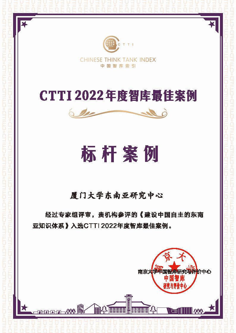 论坛公布了CTTI(中国智库索引)智库2022年度优秀成果,征集成果围绕智库建设最佳案例和智库研究优秀成果两大主题。厦门大学东南亚研究中心申报的《建设中国自主的东南亚知识体系》入选CTTI2022年度智库建设标杆案例推介名单,《巴达维亚华人社会结构研究》等二份成果分别入选“CTTI2022年度智库优秀成果”一、二等奖推介名单。