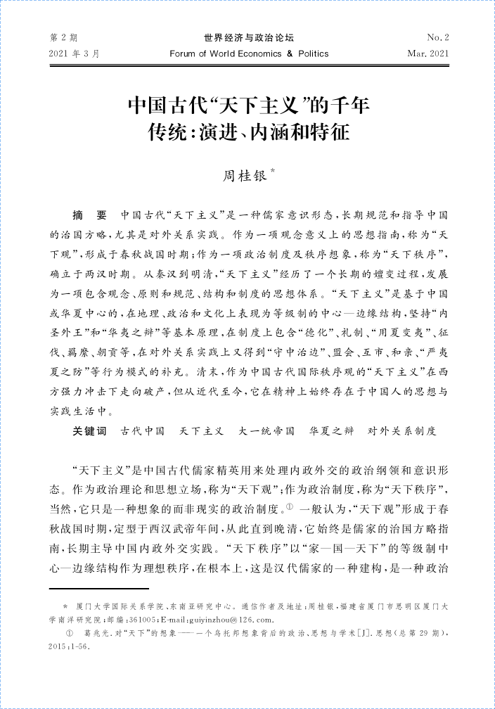 2021年3月,周桂银老师在CSSCI来源刊物《世界经济与政治论坛》上发表论文《中国古代“天下主义”的千年传统:演进、内涵和特征》。文章认为,中国古代“天下主义”是一种儒家意识形态,长期规范和指导中国的治国方略,尤其是对外关系实践。作为一项观念意义上的思想指南,称为“天下观”,形成于春秋战国时期;作为一项政治制度及秩序想象,称为“天下秩序”, 确立于两汉时期。从秦汉到明清,“天下主义”经历了一个长期的嬗变过程,发展为一项包含观念、原则和规范、结构和制度的思想体系。“天下主义”是基于中国 或华夏中心的,在地理、政治和文化上表现为等级制的中心—边缘结构,坚持“内 圣外王”和“华夷之辩”等基本原理,在制度上包含“德化”、礼制、“用夏变夷”、征 伐、羁縻、朝贡等,在对外关系实践上又得到“守中治边”、盟会、互市、和亲、“严夷 夏之防”等行为模式的补充。清末,作为中国古代国际秩序观的“天下主义”在西方强力冲击下走向破产,但从近代至今,它在精神上始终存在于中国人的思想与实践生活中。