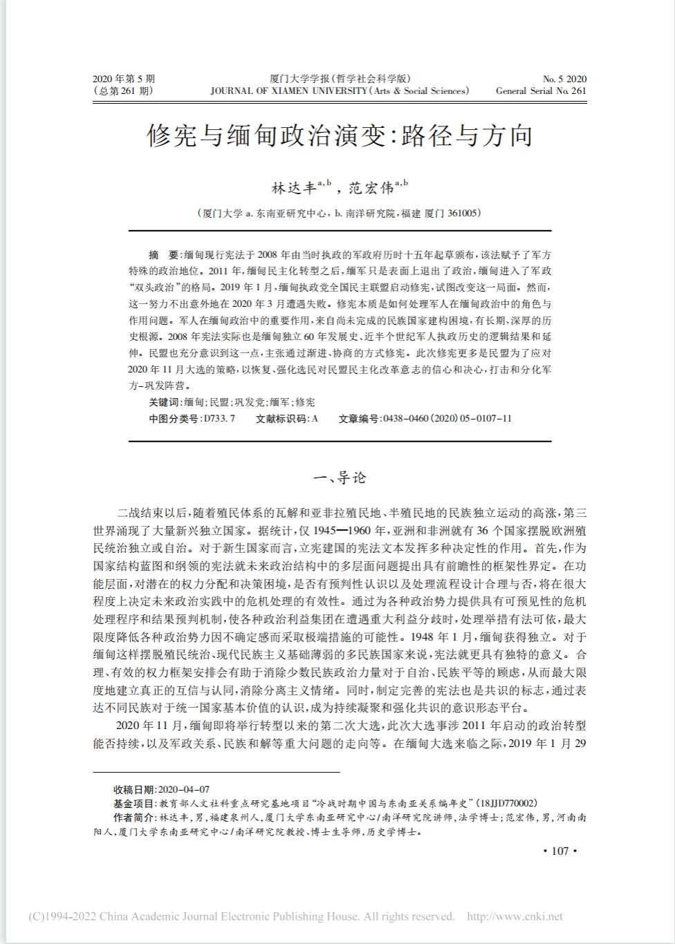 2020年9月,林达丰老师、范宏伟老师在CSSCI来源刊物《厦门大学学报(哲学社会科学版) 》上发表论文《修宪与缅甸政治演变:路径与方向》。文章指出,缅甸现行宪法于2008年由当时执政的军政府历时十五年起草颁布,该法赋予了军方特殊的政治地位。2011年,缅甸民主化转型之后,缅军只是表面上退出了政治,缅甸进入了军政"双头政治"的格局。2019年1月,缅甸执政党全国民主联盟启动修宪,试图改变这一局面。然而,这一努力不出意外地在2020年3月遭遇失败。修宪本质是如何处理军人在缅甸政治中的角色与作用问题。军人在缅甸政治中的重要作用,来自尚未完成的民族国家建构困境,有长期、深厚的历史根源。2008年宪法实际也是缅甸独立60年发展史、近半个世纪军人执政历史的逻辑结果和延伸。民盟也充分意识到这一点,主张通过渐进、协商的方式修宪。此次修宪更多是民盟为了应对2020年11月大选的策略,以恢复、强化选民对民盟民主化改革意志的信心和决心,打击和分化军方-巩发阵营。