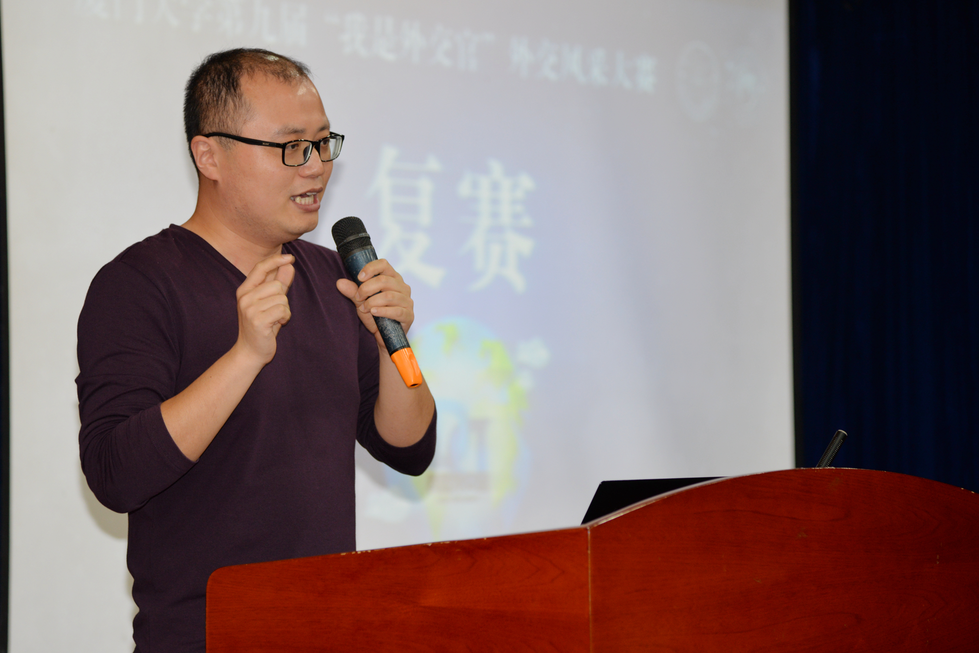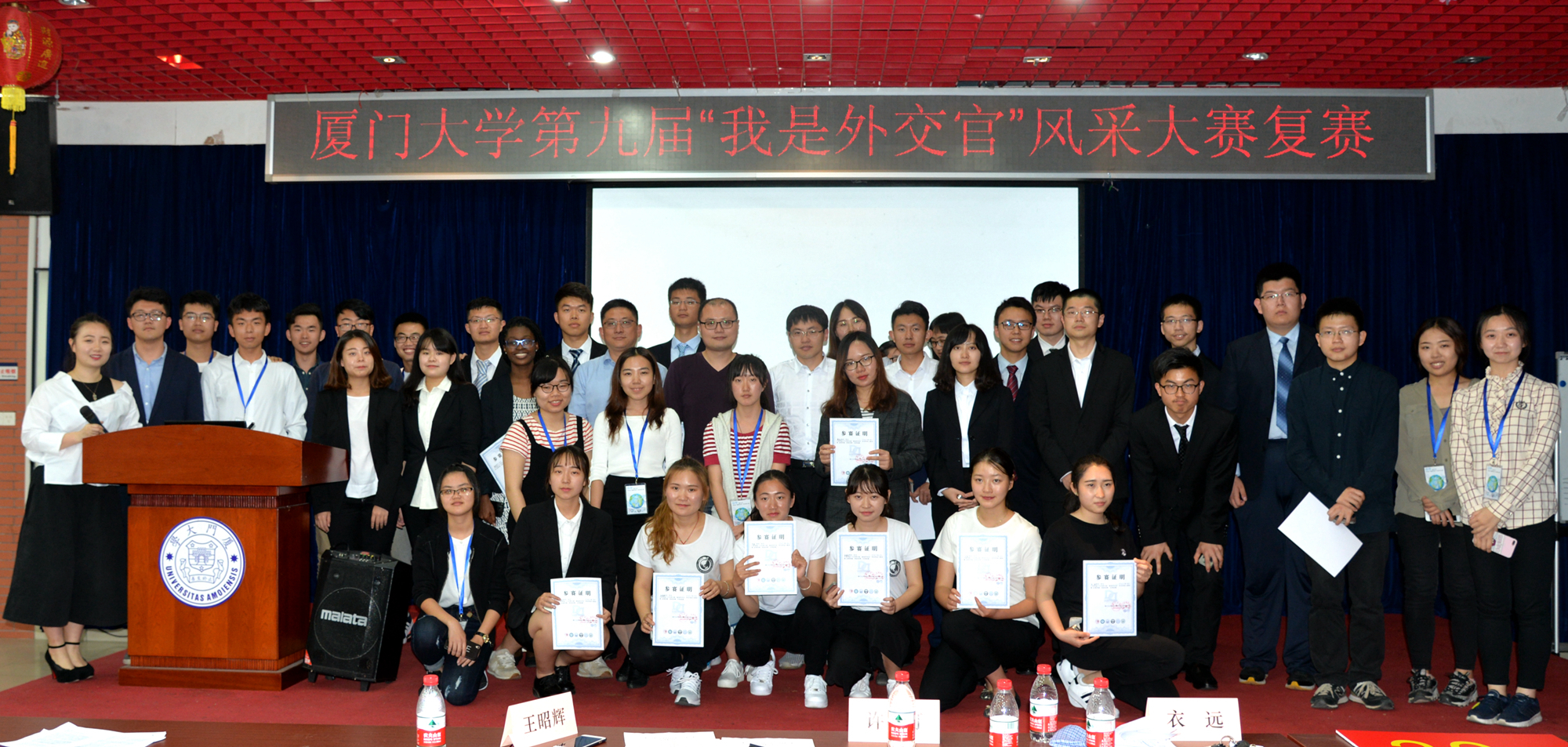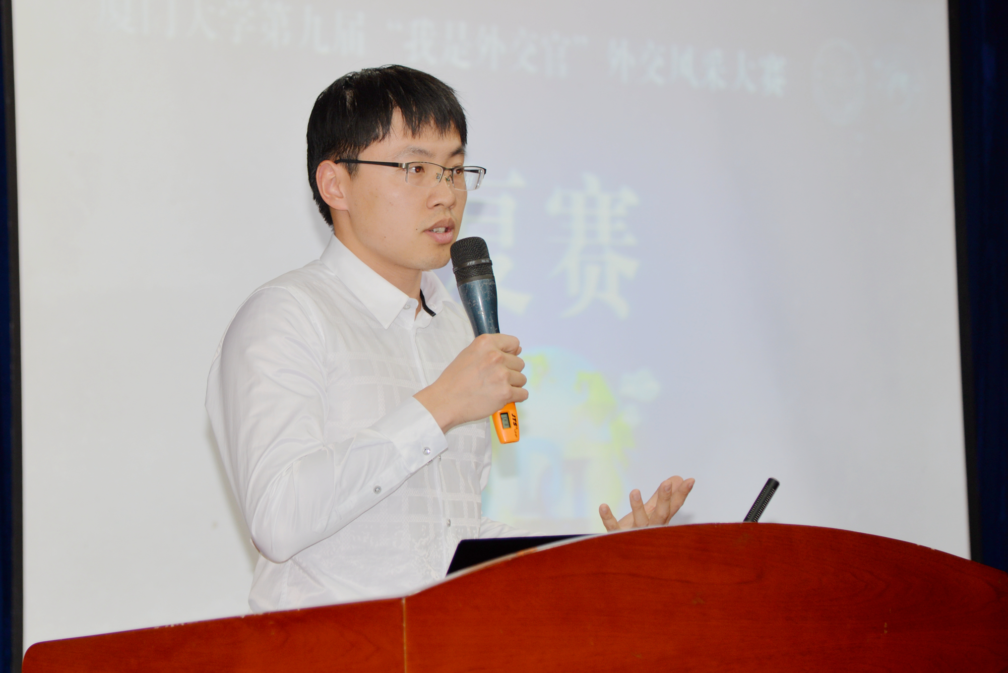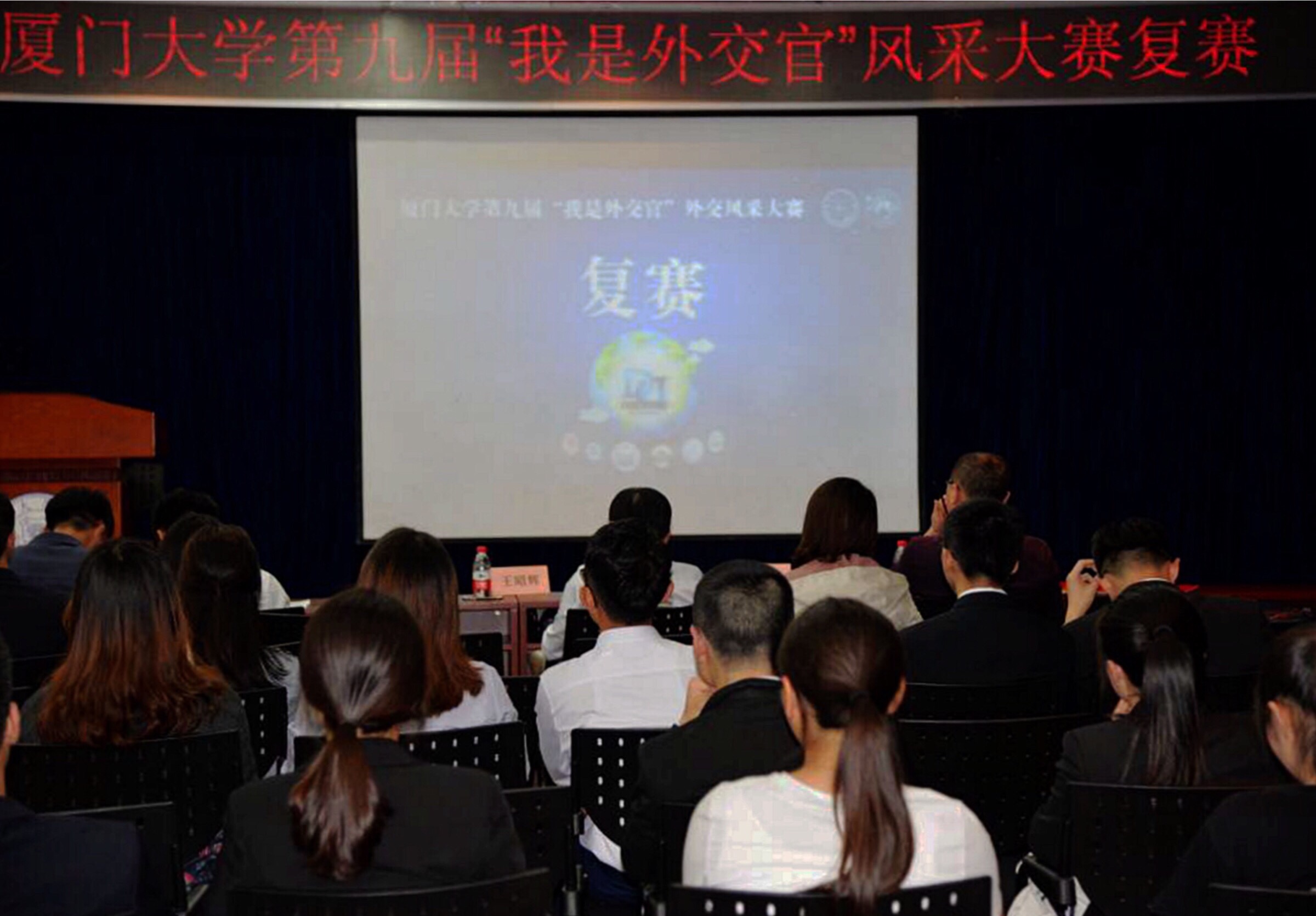 2017年4月9日18时,厦门大学第九届“我是外交官”风采大赛复赛在自钦楼多功能厅拉开帷幕。比赛邀请了厦门大学国际关系学院暨南洋研究院副教授许可、助理教授衣远、助理教授王昭晖作为评委,2015级本科生曹玉洁主持了比赛。经过初赛的选拔,厦门大学和华侨大学分别选出了六支和三支队伍晋级复赛,两轮比拼后,舞法舞天队(厦门大学)、HHH队(华侨大学)突出重围,进入决赛。